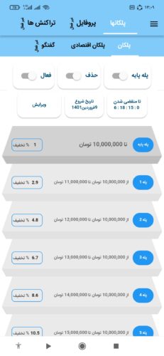 میانگین فروش 10 میلیون تومان هفتگی درج شده را، روی پله اول آورده و پله پایه فرض کرده است. 1 درصد تخفیف پایه هم به خریداران تا 10 میلیون تومان این پله در نظر گرفته است. در ادامه پله ها، تخفیف 20 درصدی که تا 2 برابر فروش یعنی تا 20 میلیون تومان در نظر گرفته بودیم را روی پله های 1 تا 10 آورده و به 10 پله فروش و تخفیف تقسیم بندی کرده است. تخفیف 40 درصدی که تا 3 برابر فروش یعنی تا 30 میلیون تومان را هم که در نظر گرفته بودیم را از پله 10 تا 20 به 10 پله فروش و تخفیف تقسیم بندی کرده است.
